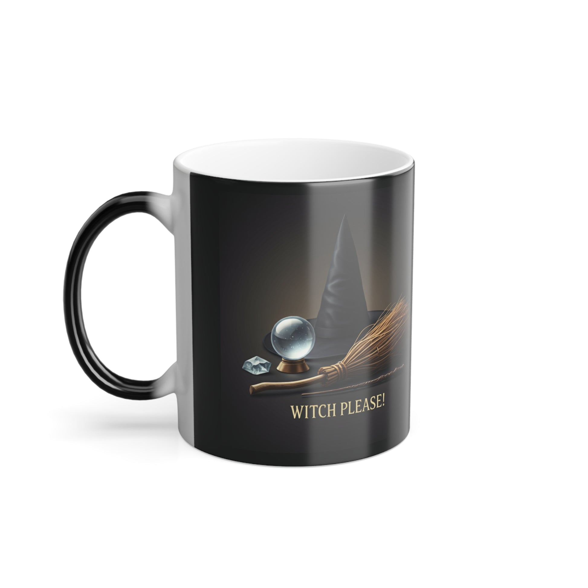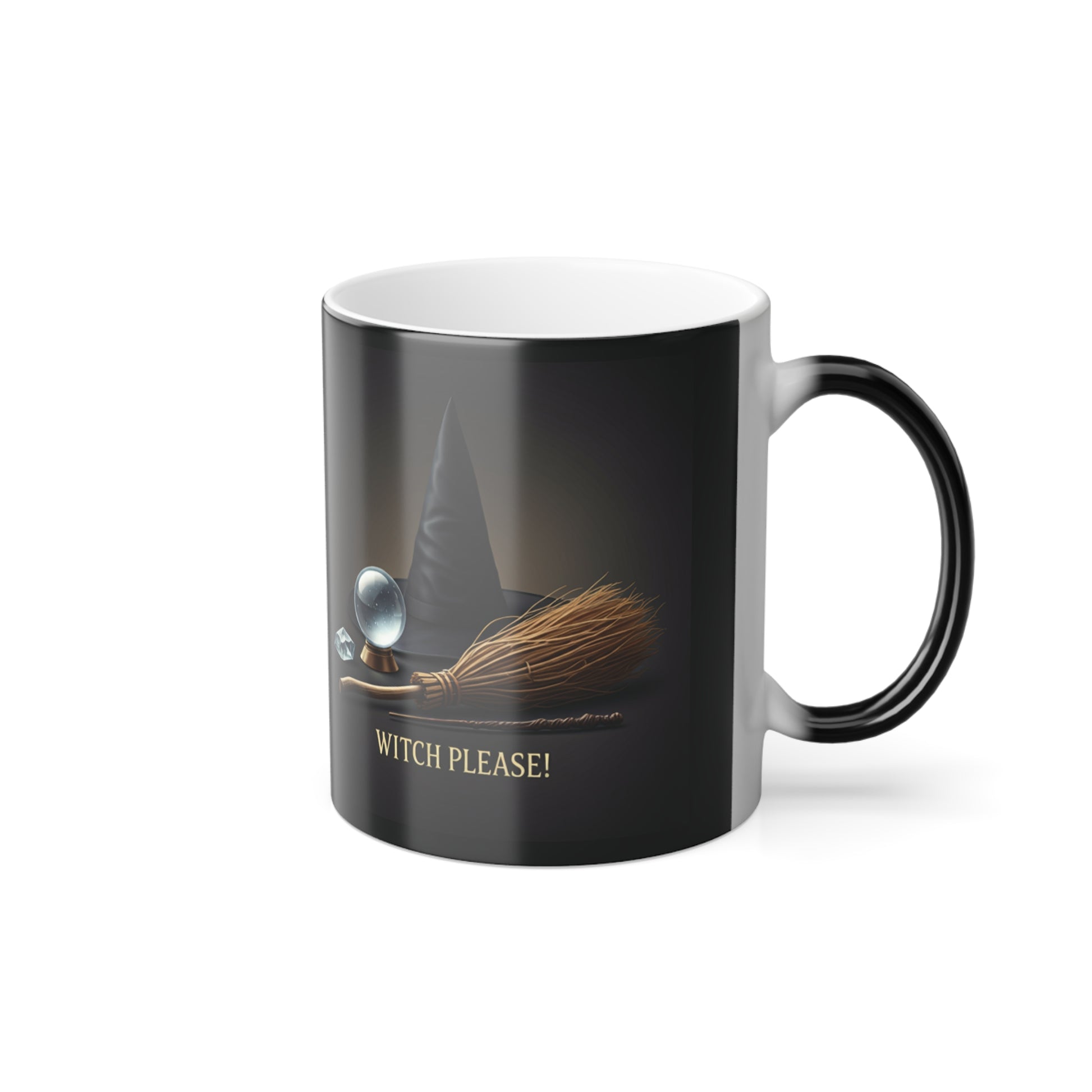 This heat-sensitive color morphing mug features a fun 'witch please' design that reveals itself when a hot drink is poured in. Perfect for those who enjoy quirky and humorous touches to their morning routine. Ideal for Halloween, birthdays, or as a gift for a witchy friend.