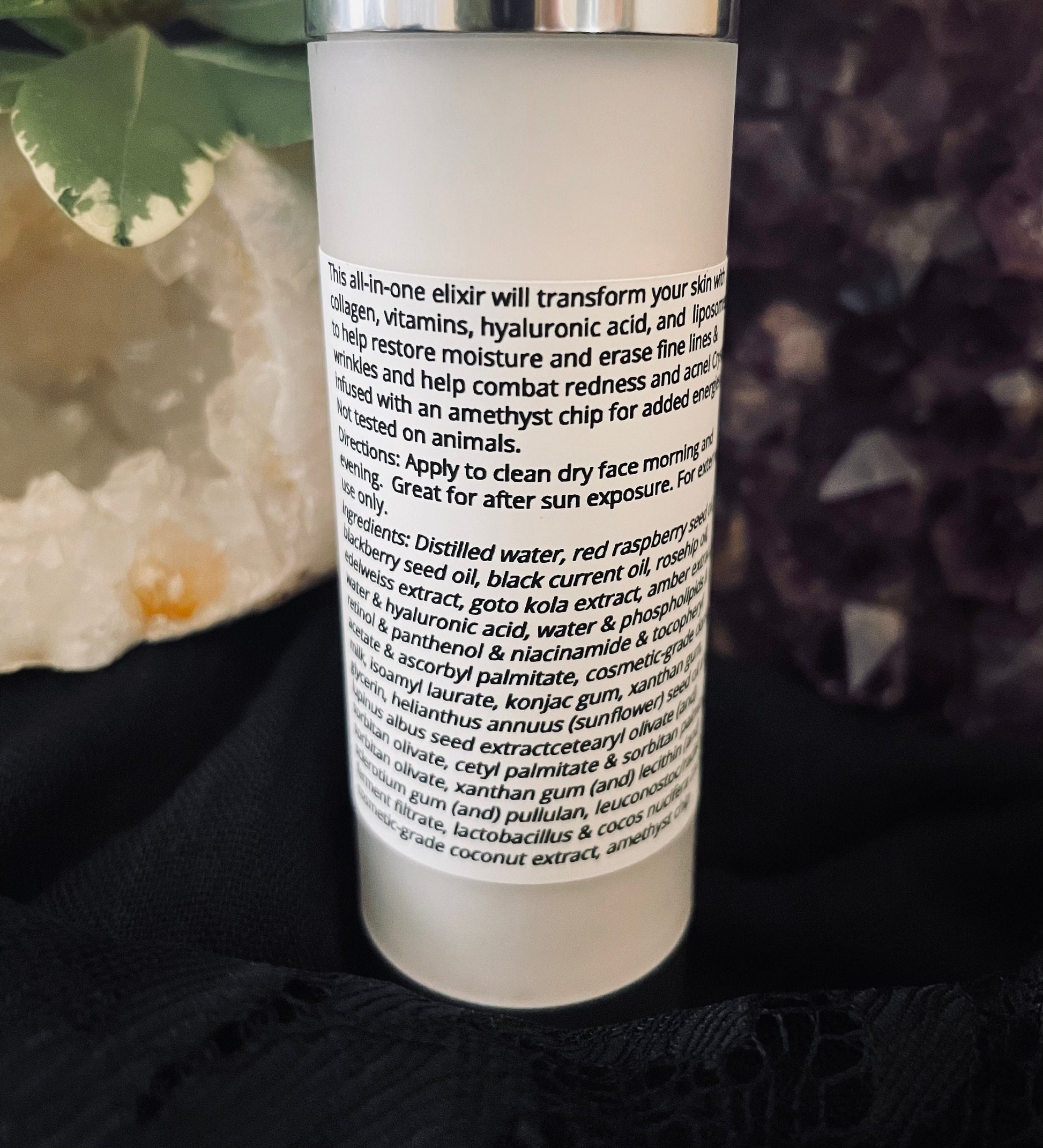 Ingredients: Distilled water, red raspberry seed oil, blackberry seed oil, black current oil, rosehip oil, edelweiss extract, goto kola extract, amber extract, water & hyaluronic acid, water & phospholipids & retinol & panthenol & niacinamide & tocopheryl acetate & ascorbyl palmitate, cosmetic-grade donkey milk, isoamyl laurate, konjac gum, xanthan gum, glycerin, helianthus annuus (sunflower) seed oil and lupinus albus seed extractcetearyl olivate (and) sorbitan olivate, cetyl palmitate & sorbitan palmitate & sorbitan olivate, xanthan gum (and) lecithin (and) sclerotium gum (and) pullulan, leuconostoc/radish root ferment filtrate, lactobacillus & cocos nucifera coconut, cosmetic-grade coconut extract, amethyst chip